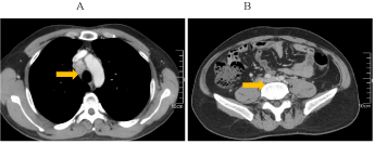 Figure 3. A: enlargement of mediastinal lymph nodes; B: multiple enlarged retroperitoneal lymph nodes were larger than before.