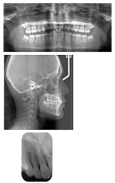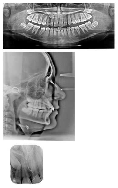 Figure 15. Panoramic, lateral cephalometric and peri apical radiographs after orthodontic treatment finished