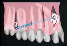 Figure 6. A schematic drawing of the recently developed VISTA technique (Vertical Incision Subperiosteal Tunnel Access), a minimally technique, combined with bone screws which is indicated in labially impacted cuspids