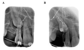 Figure 9. A- Intra oral radiograph immediately before horizontal movement of #13; B-3 months post traction #13