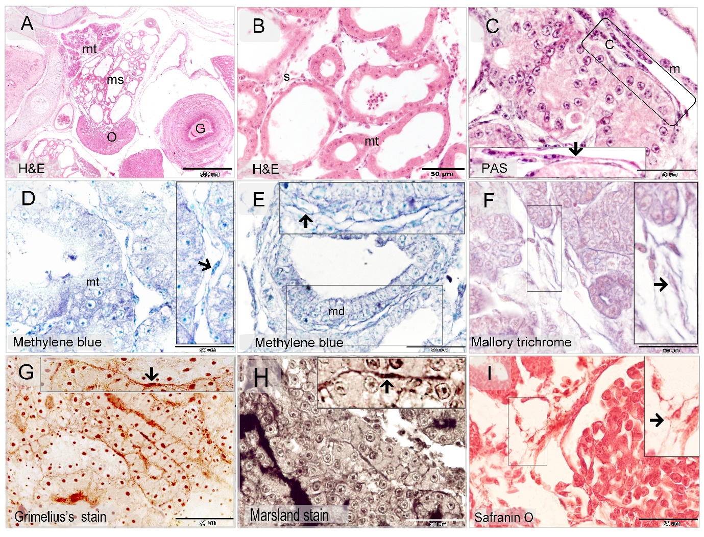 The current study investigated telocytes during the development of mesonephric kidney in quail embryos and their relation to nephrogenic progenitor cells. Stromal cells were identified between the renal tubules of the mesonephric kidney by using H&E (Figures 1A, B) Methylene blue (Figures 1D, E), PAS (Figure 1C), Safranin O (Figure 1I), Marsland silver stain (Figure 1H), Grimelius’s silver nitrate method (Figure 1G), Mallory trichrome (Figure 1F).