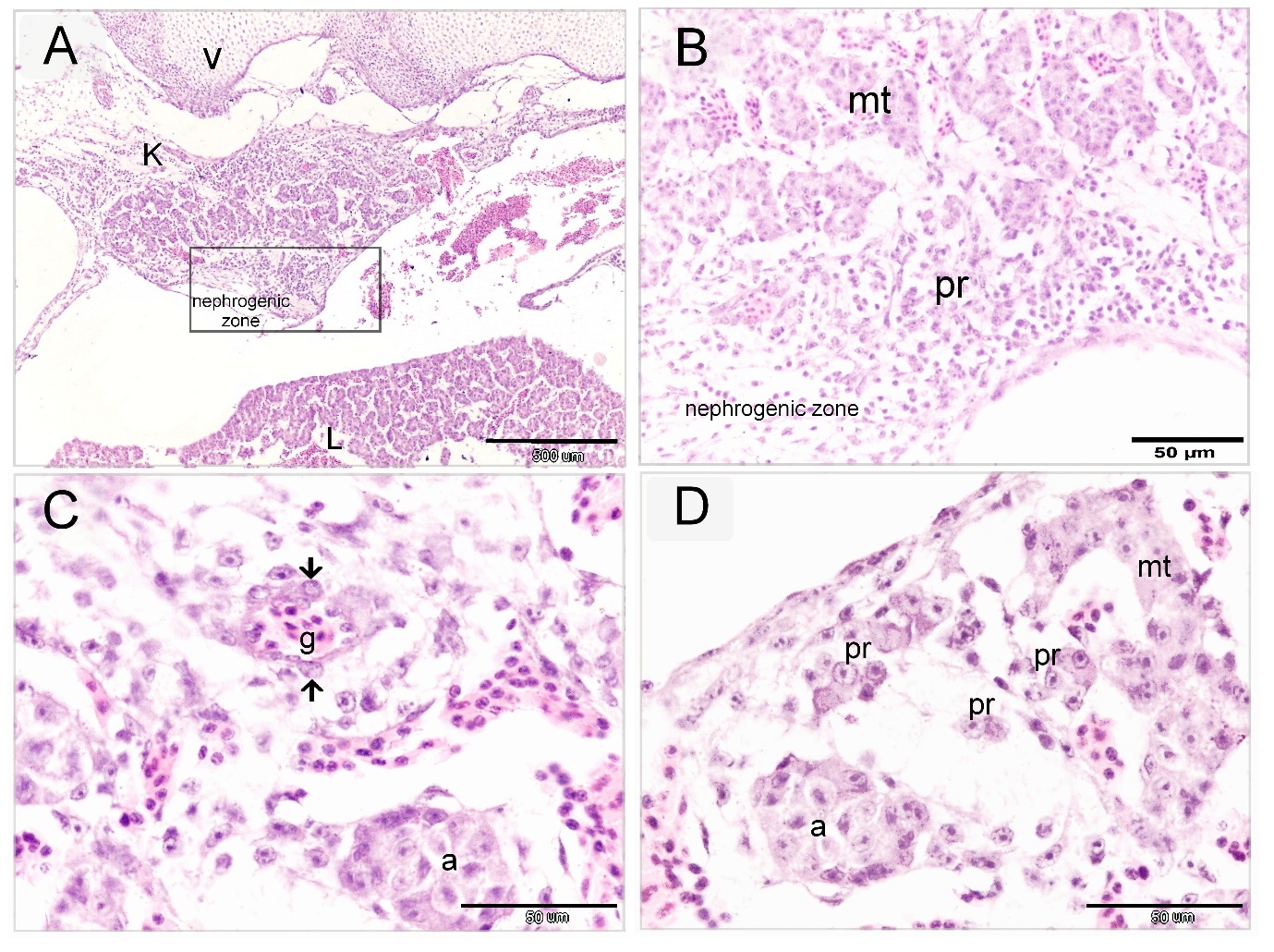 Using light and TEM, mesonephros had a well-organized nephrogenic structure except for the peripheral nephrogenic zone in which different stages of the developing nephrons were observed. Mesonephric mesenchyme differentiated into epithelioid masses which established cellular contact and formed the epithelial sheath of the mesonephric cords. The developmental events of the avian mesonephros is similar to human. The intermediate mesoderm forms the nephrogenic cord which develop the mesonephric tubules [25].