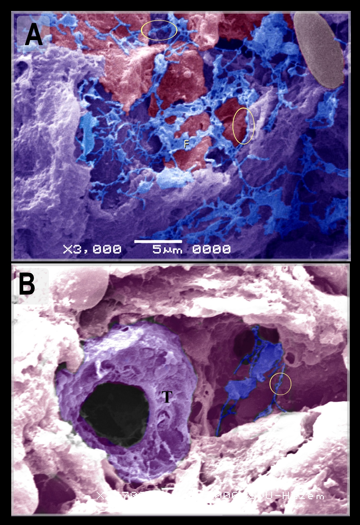 Transmission electron microscopy images were colored using photo filter 6.3.2 program. Coloring images required to change the color balance, using the stamp tool to color the objective cells.