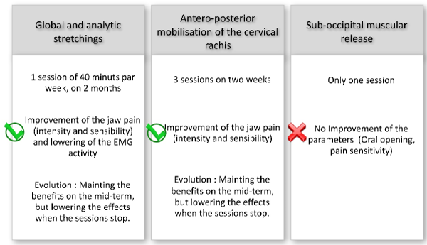 [18] compared the effects of stretching anterior and posterior chains to analytic stretching of cervico-facial regions and of the upper limbs, combined with preliminary cervical pumping [18]. In 2013, La Touche et al. [21] noticed the effects of antero-posterior mobilization of the upper cervical rachis and compared the data to a placebo group. Rodriguez-Blanco [19] appreciated the effect of a sub-occipital myofacial inhibition technique combined to hamstring stretching and longitudinal masseter massage. At last, chain stretching or cervical analytics combined to upper cervical articulation mobilization seems to improve muscular TMD associated symptoms [18,21]. The sub-occipital myofacial inhibition technique does not improve pain sensitivity, nor maximum oral aperture in immediate post intervention evaluation [19] (Figure 2).