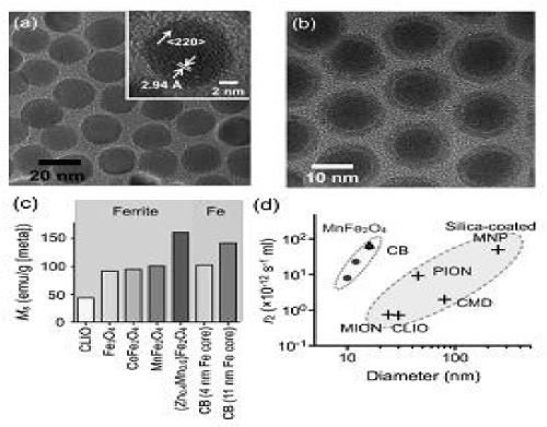 The magnetization of ferrite nanoparticles can be further enhanced by doping the ferrite with ferromagnetic elements such as manganese (Mn), cobalt (Co) or nickel (Ni). Among the singly-doped ferrite MNPs, Mn Fe2O4 nanoparticles were found to exhibit the highest magnetization and r2 value, on account of their electron spin configurations, followed by FeFe2O4, CoFe2O4, and NiFe2O4. More recently, it has been demonstrated that magnetization can be further enhanced via additional Zn2+ dopant control in MnFe2O4 nanoparticles.