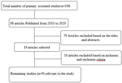 The electronic search identified more than 198 articles. Out of the 98 articles obtained, 79 were excluded based on initial screening of the title and abstract, as they are not relevant to the objectives of the present review. After the application of the inclusion and exclusion criteria during the reading of the complete texts, nine articles were included in the present study [Figure 1].
