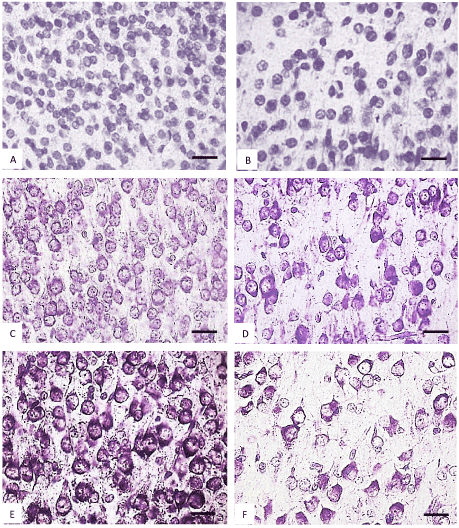 Figure 4. The parietal cortex inner pyramidal neurons (5th layer) in the controls (A, C, E) and antenatally alcoholized rats (B, D, F) on the 2-(A, B), 5-(C, D) and 10th (E, F) days after birth. Stained by the Nissl method. Digital microphotography. Scale bars - 20 µm, magnification-40x.