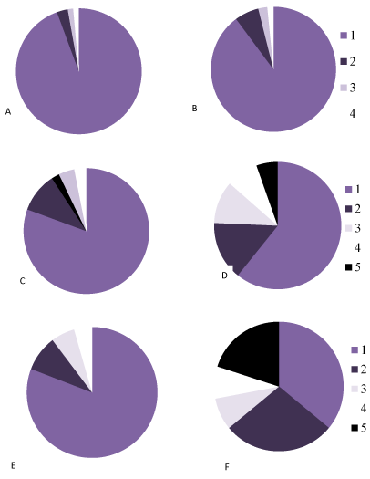 Figure 6. The percentage of neurons with different chromatophilia of cytoplasm in the parietal cortexin controls (A, C, E) and antenatally alcoholized rats (B, D, F) on the 5- (A, B), 20- (C, D) and 90th (E, F) days after birth.