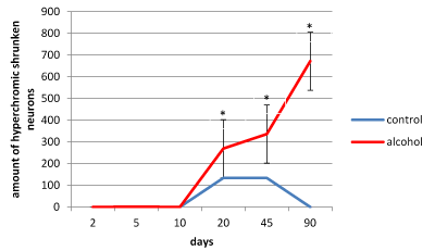 Alcohol consumption by rats during pregnancy influenced the thickness of the parietal brain cortex in their offspring (Figure 1). On the 2nd and 5th days after birth the cortex was thicker, as compared to the controls. On the 10th postnatal day it became significantly thinner than in the controls, on the 20th and 45th days the difference disappeared, but on the 90th postnatal day it became significantly thinner again (Figure 1).