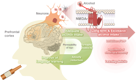 Side effects from acute and chronic alcohol consumption are well known. Paradoxically, however, the possibility that a moderate intake of alcohol may have a positive impact on secondary language learning has long been reported, and is also a popular belief. Recently, it has been reported that alcohol consumption improves the pronunciation of foreign languages as well as the memory effect.  However, there is no definitive report on the mechanism by which alcohol is involved in memory enhancement and language learning. This review aims to provide an understanding of these effects and provide a blueprint for futher research by neurologically describing the mechanisms and possibilities that alcohol may have on language learning.