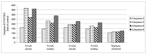 In this study, caspase 2, 3, 8 and 9 was activated in surrounding tissues of ti-implanted rabbits. It is determined that simultaneous administration of OO and UA significantly increase that activation in both local and oral applications. According to these results, it could be claimed that UA and OO have pro-apoptotic feature.