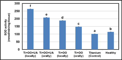 Figure 6. Effects of usnic acid (UA) and olive oil (OO) on changes in the activity of superoxide dismutase (SOD) in tissues surrounding implant of titanium (Ti)-implanted rabbits, in tissues surrounding implant of titanium (Ti)-implanted rabbits. Means in the same column by the same letter are not significantly different to the Duncan test (=0.05). Results are means ± SE of three measurements