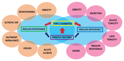 The state of insulin resistance is inherited in patients with T2D and, some specific cellular and molecular abnormalities that affect the biologic action of insulin in tissues have been identified [5,6]. The responsible genes are known to be linked to some common gene variations, known as single nucleotide polymorphisms [SNPs]. Although the actual genetic defects underlying the risk for T2D have not yet been fully identified. It is believed that susceptible individuals carry genotypes that predispose the development of tissue insulin resistance at the cellular level. Whether there are additional genes that account for defective islet-cell responses to glucose and other stimuli is not entirely clear. In any case, this genetic material has very high penetrance and tends to occur frequently in first-degree relatives. In addition to the genetic imprint, numerous environmental factors, most importantly body weight and fat excess, sedentary lifestyle and lack of exercise, play a critical role and aggravate the inherited resistance to insulin action [7]. It is now recognized that in susceptible individuals, the presence of one or many of these conditions contributes to worsening of the metabolic state of tissue insulin resistance. In the long-term, the invariable outcome is the acceleration of beta-cell failure evolving to complete exhaustion manifested with overt type 2 diabetes [8].