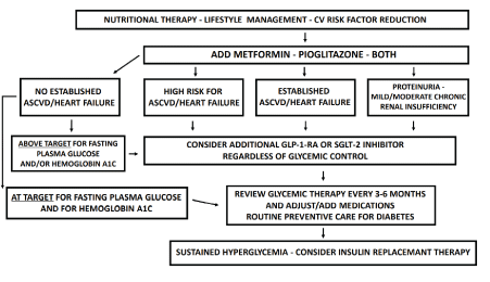 New recommendations for the treatment of pre-diabetes and type 2 diabetes [T2D] extends beyond glucose lowering. These are based on recent introduction of anti-hyperglycemic agents that can protect insulin secretory capacity with demonstrated cardiovascular [CV] and renal benefits. Subjects at risk for developing T2D, for instance, obese, sedentary individuals with positive family history of type 2 diabetes in first-degree relatives qualify for initial implementation of nutritional therapy, lifestyle management and CV risk factor reduction strategies. Thereafter, clinical and laboratory data are gathered and subjects characterized as pre-diabetes are started on metformin (500 mg twice daily) or pioglitazone 15mg/day. Within 3-6 months, the metformin or pioglitazone dose must be doubled and, a thorough re-assessment of the nutritional goals and the adherence to lifestyle modifications must be undertaken. Recommendations should be personalized and guided by competent professionals in each area of expertise. Patients with no risks for atherosclerotic cardiovascular diseases [ASCVD] or heart failure and, who are within target for fasting plasma glucose [i.e., 70-110 mg/dl] and HbA1C ≤ 6.5%, should follow up every 3- 6 months. The overall risks are then reviewed and routine preventive care for diabetes is provided. In contrast, those who are at high risk or have established CV disease and, those who have mild-to-moderate renal insufficiency i.e., estimated GFR ≤ 60 ml/min.1.73m2 with proteinuria, must be started on GLP-1 RA or SGLT-2 inhibitor therapy. The latter is also suggested for patients who are above target for glycemic indices, although they might not have evidence of CV or renal disease. The choice of the GLP-1-RA or SGLT-2 inhibitor depends upon the overall clinical characteristics, drug tolerance and affordability for each patient. At this stage, all that meet the criteria outlined above should be given full dose triple therapy with metformin, pioglitazone and either a GLP-1-RA or a SGLT-2 inhibitor. Many other alternative anti-diabetic agents might be considered, but when hyperglycemia is sustained, insulin replacement therapy must be started. At this stage, basal insulin therapy is initiated, as a single daily dose of a long-acting preparation. Pre-prandial doses of short- or rapid-acting insulin formulae should follow. All anti-diabetic drugs, oral and injectable, except for sulfonylureas should be maintained.