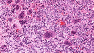 Figure 4. Osteoclastoma comprised of uniform, multinucleated giant cells disseminated within a stroma rich in mononuclear cells of monocytic lineage and foci of fibro-histiocytic proliferation with red cell extravasation [12]