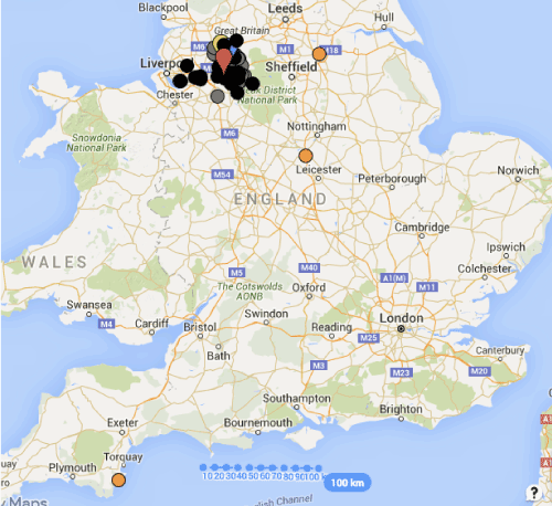 Figure 1. UK map showing distributions of patients’ home addresses. Hospitals in the Greater Manchester collaborative are tear shaped icons and outliers appear orange. Orthoplastic patients shown in grey, black is orthopaedic patients
