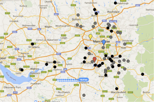 I used satellite data to map postcodes and marked the centre of the postcode corresponding to the patient on the map, the map was produced using Google maps. I also marked on the map UHSM, MRI and Salford royal; the hospitals that form the Greater Manchester Collaborative. For distances of travel straight line distances were used that are calculated by Pythagoras theorem, these measurements were recorded to the nearest 0.1 km.