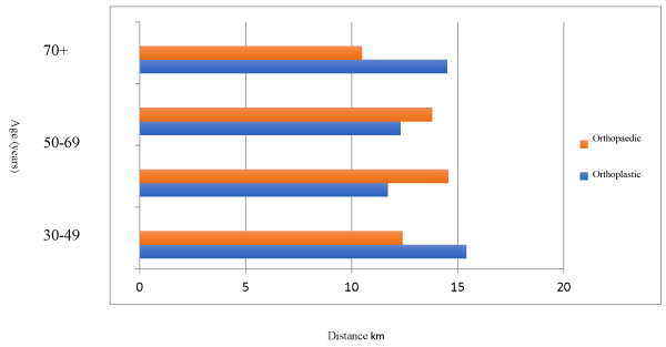 Distances travelled with age between the groups can be seen below in figure 5. In the orthoplastic group the youngest patients travelled the furthest.