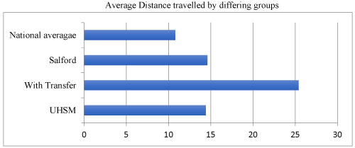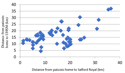 Figure 8. Graph showing the trends in data based on distances from patients homes to UHSM and Salford Royal