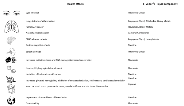 At two hours after e-cigarette use, nicotine, 1,2-propanediol, aluminum, glycerin and polycyclic aromatic hydrocarbons increase in blood to levels that they might be carcinogenic [43]. Though, 1,2-propanediol and ethylene glycol entail significantly less health risks as compared to nicotine [44]. In terms of propylene glycol, exposure to it irritates the eyes and lungs [45], whereas repeated inhalation affects the central nervous system and the spleen [46].