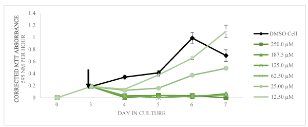 Figure 3. Corrected MTT absorbance values (absorbance at 595 nm per 1 hour of incubation with the MTT reagent) as a function of days in culture is shown as mean and SD for n = 3 replicates. The arrow indicated the time of addition of DMSO only or harmine dissolved in DMSO