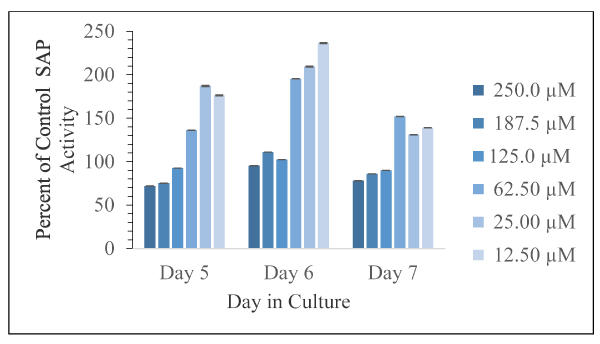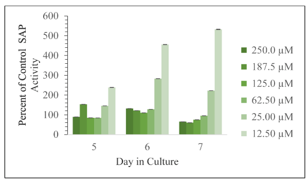 Generally, with increasing doses of harmine and tryptamine, the detection of SAP activity decreased. Harmine has inhibitory effects on Days 5 and 7 at 125.0 µM, 187.5 µM, and 250.0 µM concentrations. Tryptamine has inhibitory effects on Day 5 (62.5 µM, 125.0 µM, and 250.0 µM) and Day 7 (62.5 µM, 125.0 µM, 187.5 µM, and 250.0 µM). Harmaline exposure led exclusively to activation. Harmaline activation doubles from Day 5 to Day 6, and then decreases by half on Day 7. Interestingly, the compounds that are structurally most similar, harmine and harmaline, do not affect SAP activity to the same degree. Harmaline exposure led exclusively to activation of SAP activity, but harmine exposure led to activation or inhibition depending on dose.