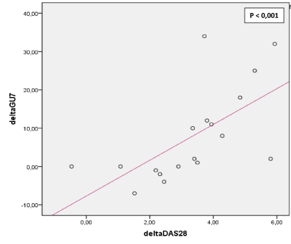 Figure 2. Correlation between ∆DAS 28 and ∆GUS7. ΔDAS28: Variations of disease activity between M0 and M6 .ΔGUS7: Variations of GUS7 between M0 and M6