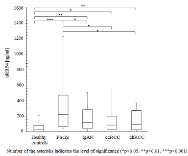 Results: The MS study identified 194 (FSGS), 179 (IgAN), 271 (ccRCC), 255 (chRCC), and 275 (healthy controls) urinary proteins. The comparative proteomic analysis revealed that urinary Retinol-binding protein 4 (uRBP4) clearly discriminates FSGS from the rest of the groups. Increased levels of uRBP4 in FSGS urine specimens were also evidenced by ELISA. Significantly elevated levels of uRBP4 were also observed for IgAN, ccRCC and chRCC versus healthy individuals.