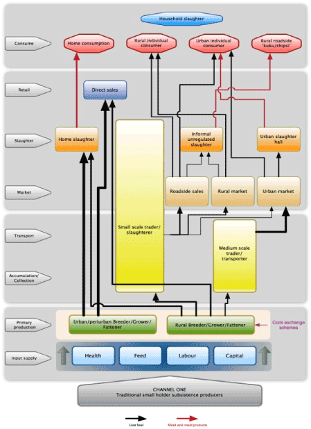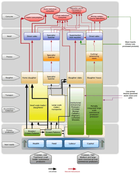 The white meat value chain in Tanzania comprises both pigs (pork) and domestic fowl (chicken). The chain includes live animals, fresh meat, processed meat products and by-products from these species. Primary producers, traders in animals, in meat and in by-products, processors, butchers, other retail outlets and consumers participate in the chain. From supply and use of inputs, via production and processing to marketing and retailing the chain is confounded by a plethora of technical and institutional impediments. Fragmentation, lack of organization, absence of control (in spite of over-regulation) and almost total lack of coordination characterize the chain. Many participants have more than one role. Goods and services include land, labour, live animals, veterinary supplies, feed supplies, transport, energy, finance and (perhaps above all and what is most lacking) institutional support. Clearly defined and enunciated standards and a regulatory framework under law are needed. Many of these requirements continue to be weak, non-existent or are not applied in Tanzania.