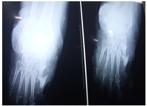 The patient’s parents we aren’t a consanguineous couple with negative family history (particularly any similar of trophic acropathy cases in family was reported). Physical examination confirmed a two deep and large ulcer with local signs of infection and widespread necrosis were observed in the soles of right foot and a cubic deformity of the left foot (Figure 1, 2 and 3).