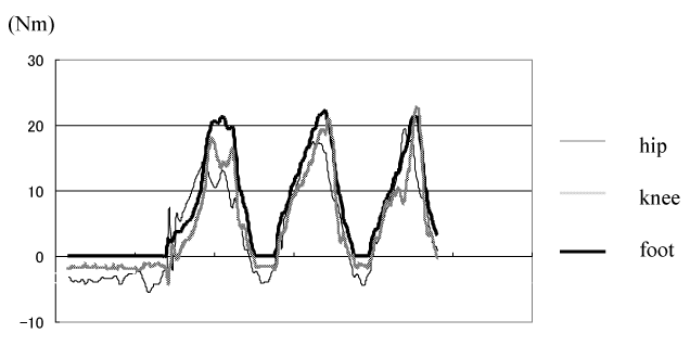 Figure 1 shows the graph of the preoperative articular moment in patient 3. In the figure, a cooperative pattern simultaneously showing extension moments of the hip and ankle joints, and plantar flexion moment of the ankle joint is observed. (In the following figures, angles in the direction of flexion of the hip joint and dorsiflexion of the ankle joint were taken as positive, and moments in the direction of extension of the hip joint and plantar flexion of the ankle joint were also taken as positive.)