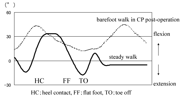 Figure 2. Hip angle on steady walk and barefoot walk in CP post-operation (case 3). No extension of the hip joint occurs during the period between the foot flat (FF) and toe off (TO), was postoperatively observed in three patients in this study.