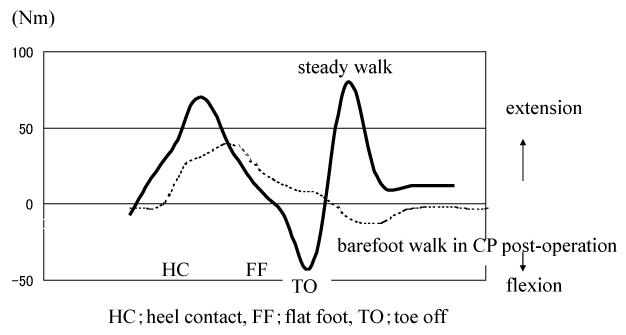 Preoperatively, a posture of bended legs, which is caused by labyrinthine flexion tonus, is characteristic of children with spastic type of bilateral cerebral palsy. Walking in this posture is possible by extension and plantar flexion moments of the hip, knee, and ankle joints induced by primitive reflex, such as spontaneous extensor tension. This reflex is cooperative extension without movement of the individual joints. In this type of walking, the hip, knee, and ankle joints extend simultaneously without separated movement of these joints, which is observed during steady walking. The cooperative extension pattern was observed in the preoperative articular moment, i.e., simultaneous extension moments of the joints shown in this study.
