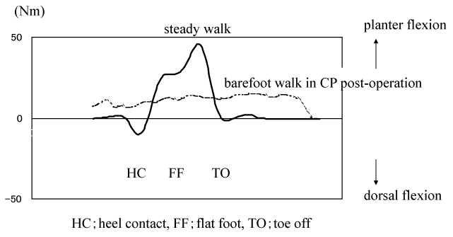 Figure 4. Ankle moment on steady walk and barefoot walk in CP post-operation (case 3).
