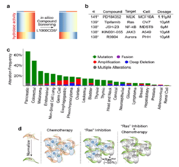 We next investigate which stroma-related pathways are enriched in pancreatic adenocarcinoma tissues versus normal tissues. We found the hydrolase activity is substantially increased in pancreatic adenocarcinoma (Figure 3a, b). Indeed, in pancreatic cancers, the serine hydrolase RBBP9 has been found to promote anchorage-independent growth in vitro and tumor-initiation in vivo [11]. In addition, hyaluronidase inhibitor PEGPH20 has been developed to reduce the “desmoplastic reaction” in the stage IV metastatic pancreatic cancer and is currently in the Phase II clinical trial. However, since hydrolase activity is also essential to diverse cellular processes such as myofibroblast and fetal development, systemic inhibition of hydrolase activity can cause side effect on other healthy tissues. Therefore, we queried the L1000CDS2 database to search for other compounds that can adverse the hydrolase activity (Figure 4a). L1000CDS2 is a dataset that integrates the LINCS L1000 small molecule expression profiles and is under development by Ma'ayan Lab at the Icahn School of Medicine at Mount Sinai [12]. The L1000CDS2 dataset will search for the small molecules that can potentially reverse the custom defined gene signature. We found that the top candidate compounds target the Ras signaling (Figure 4b). Indeed, more than 50% of the pancreatic tumors carry Ras mutation (Figure 4c). And inhibiting Ras signaling in cancer cells alone may be an effective strategy to treat pancreatic cancers. Based on our bioinformatics prediction, suppressing Ras signaling may also normalize microenvironment and increase therapeutic efficacies, which may present promising strategies for potential synergy with chemotherapy and immune checkpoint therapy, respectively (Figure 4d).