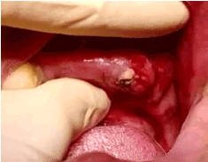 Extraoral examination showed no significant facial asymmetry, facial swelling or palpable lymph nodes. On intraoral examination (Figures 1, 2 & 3), there were five retained roots, including 22 (upper left lateral incisor), 23 (upper left canine), 34 (lower left first premolar), 35 (lower left second premolar) and 43 (lower right canine), with buccal abscesses at 34 and 43 periapical regions. There was also gross caries on 11 (upper right central incisor), 12 (upper right lateral incisor), 13 (upper right canine) and 15 (upper right second premolar). The patient had partial edentulism with only retained roots of 35, 34 and 33 (lower left canine) as well as 43 remained in the lower arch.