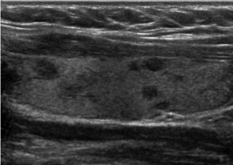 Figure 1. Ultrasonogram of left thyroid demonstrates multiple nodules and heterogeneous echotexture.