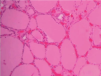 Figure 2. Thyroid tissue specimen at 10X magnification. Note the abundant amount of thyroglobulin.