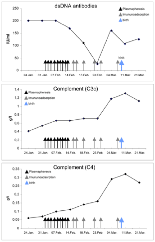 Since high-dose treatment with glucocorticoids did not alleviate the activity of disease sufficiently, we initiated plasmapheresis, eight times at intervals of one to two days. Plasmapheresis was carried out with the continuous flow system “Cobe Spectra” (Gambro), applying the program “TPE” (therapeutic plasma exchange). Eliminated plasma was substituted with fresh frozen plasma (mean volume: 2950 ml/session). After the second plasmapheresis treatment the patient felt a significant improvement of her arthritic symptoms, and her general health condition further recovered from treatment to treatment. Haemoglobin was stabilised between 9 and 11 g/dl after administration of six red blood cells concentrates. After eight treatments, anti-dsDNA antibodies decreased to 169.2 IU/ml, and C3c/C4 increased to 0.66 g/l / 0.11 g/l, respectively. However, following the 9th plasmapheresis treatment was stopped and an immunoadsorption was initiated to limit both the loss of valuable serum proteins and the patient’s exposure to foreign blood products. Prednisolone therapy could be tapered to a daily dose of 30 mg. Immunoadsorption was performed six times, at intervals of 2 to 4 days, using the “Immunosorba” system (Protein A column, Fresenius Medical Care). Under this therapy, clinical symptoms, renal function and laboratory parameters improved further, even normalised (C3c 1.31 g/l, C4 0.32 g/l, dsDNA-Ab 106.4) Figure 1A-1C.  Serum IgG levels were beneath the lower detection threshold now (<3.00 g/l [reference 7-16 g/l]), and CD4/CD8 ratio decreased to 0.89 thus reflecting both humoral and cellular immunodepression resulting in a reactivation of cytomegaly. At the 28th gestation week, the patient delivered a healthy child without any complications. During the postpartum period, the daily prednisolone dose was further reduced, without clinical signs of relapse.