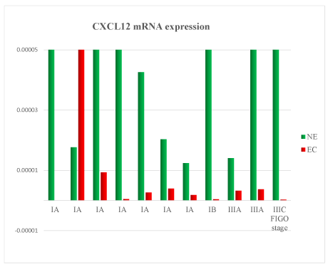 Figure 3. CXCL12 mRNA expression in tissue samples from surgical speciment. In microenvironment of endometrial cancer samples (EC) compared with normal endometrium counterpart (NE), CXCL12 mRNA was down-regulated in 91% of cases