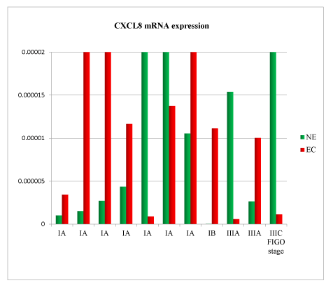 Figure 4. CXCL8 mRNA expression in tissue samples from surgical speciment. In microenvironment of endometrial cancer samples (EC) compared with normal endometrium counterpart (NE), CXCL8 mRNA was down-regulated in 64% of cases