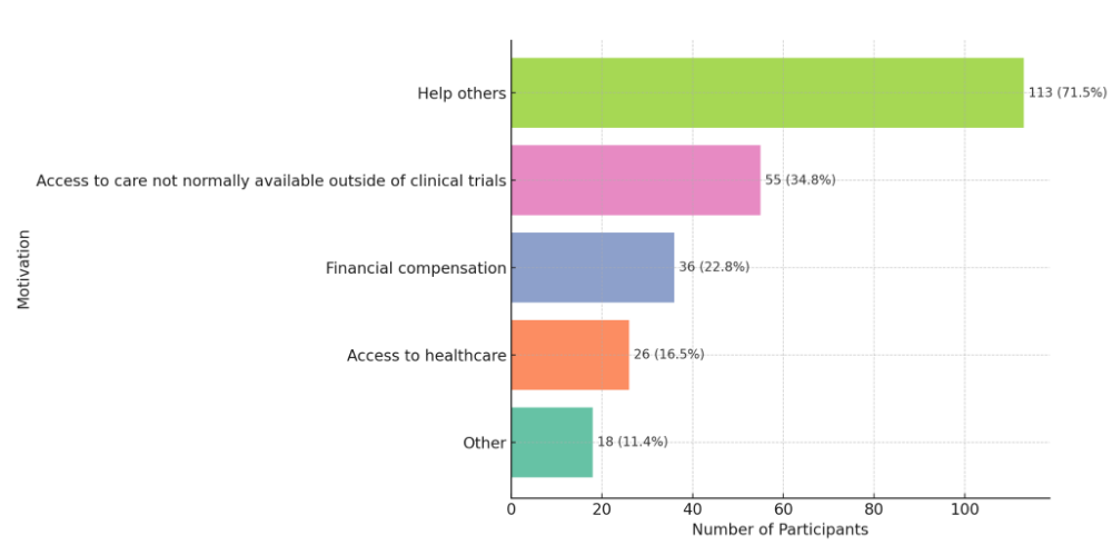 Participant motivations varied significantly across demographic lines. Altruism was the most commonly cited reason for participation across all education levels, with 70.7% of graduate degree holders and 100% of those with less than a high school education citing the desire to help others. However, need-based motivations such as financial compensation and access to healthcare were more common among participants with lower educational attainment. For example, participants without a high school diploma were the most likely to join for clinical care access (100%) and had the highest rate of financial compensation motivation (50%).