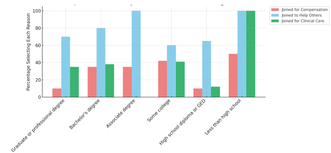 Educational attainment further influenced reported motivations. Among participants with less than a high school education, 100% indicated they joined to access clinical care, and 50% cited financial compensation as a motivating factor.