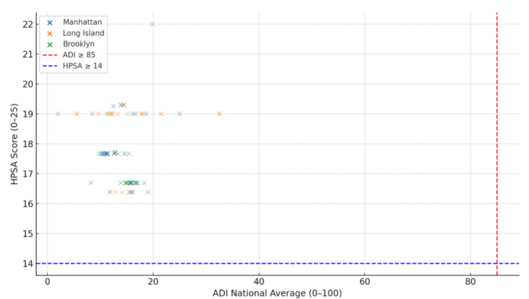 Figure 3 displays a scatterplot of participant ZIP codes stratified by Area Deprivation Index (ADI) national average (x-axis) and Health Professional Shortage Area (HPSA) score (y-axis). Each point represents a participant ZIP code, colored by Clinical Research Center (CRC) site: Manhattan, Long Island, or Brooklyn. The red dashed line marks the national ADI threshold for high deprivation (ADI ≥ 85), and the blue dashed line marks the HPSA threshold for provider shortage designation (HPSA ≥ 14). The absence of participants in the upper-right quadrant indicates a recruitment gap from areas with both high social and healthcare provider disadvantage