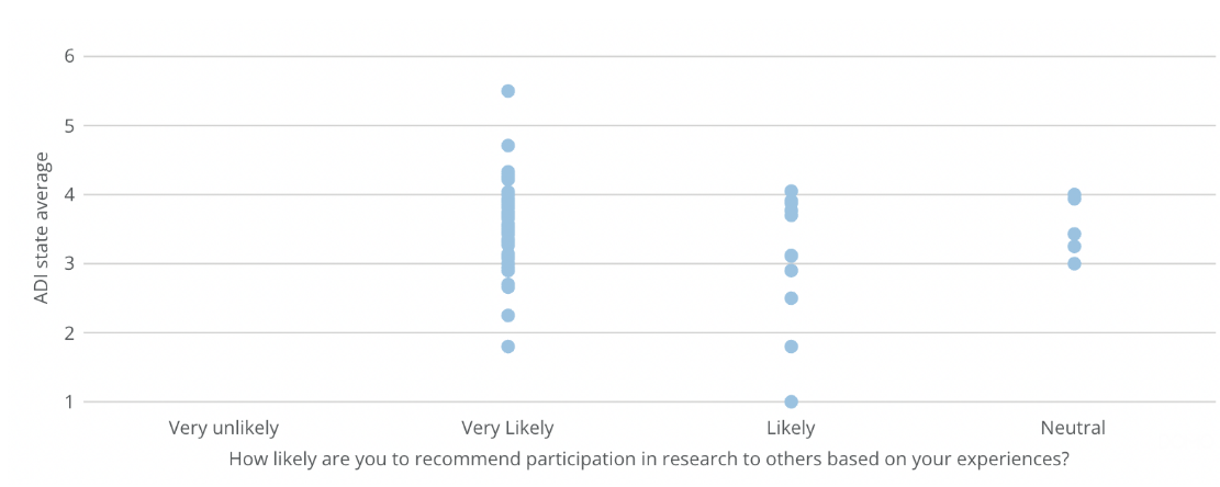The scatter plot in Figure 4 visualizes the distribution of participants’ responses across state ADI averages, which ranged from 1 (least disadvantaged) to 5.5 (most disadvantaged) in this sample. The plot illustrates overwhelmingly positive responses across all ADI levels, with the majority of participants indicating they were “Very likely” to recommend research participation. Responses of “Likely” and “Neutral” were present but less frequent across all ADI values.