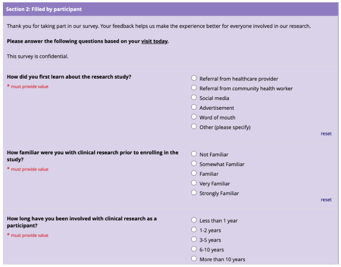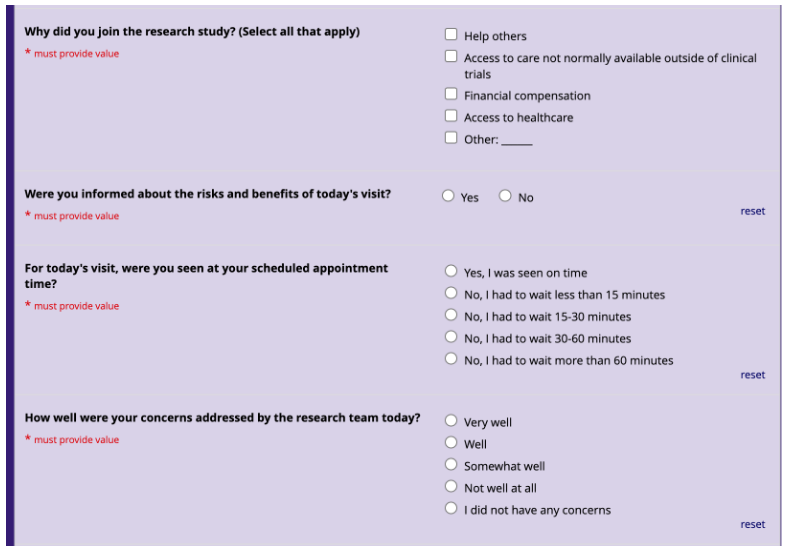 Furthermore, limited research is available connecting patient experience as it relates to specific populations, diseases, and clinical trials [2,4,5]. Current methods to evaluate whether researchers are achieving these goals primarily focus on learning why a participant might join a study and their understanding of the research [6]. Although participants’ experiences in clinical research can significantly influence their adherence to study protocols and retention, limited data has been collected on this perspective [7]. The literature has demonstrated that patient feedback leads to improvements in clinical care, such as better communication among healthcare teams and informs best practice [4,8]. It is standard practice to gather feedback from hospitalized and ambulatory patients about various aspects of their healthcare experience, but a very limited number of national institutions have implemented surveys to exclusively gauge research participant experience [9]. It is important to consider research participants' perceptions of their experiences within a study to enhance patient retention and satisfaction [10]. This may involve assessment of the participant’s comfort level during appointments, the clarity of communication from the research team, and the support they receive for participation [11]. Quality evaluation of the research participant’s perspective will better equip research teams to consider participants' viewpoints when designing and conducting clinical studies [4].