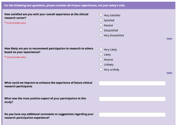 Participant experience in clinical research is critical to recruitment, retention, and overall study quality. While Press Ganey surveys are widely used in hospitals to assess patient satisfaction, there is no standardized post-visit evaluation tool for clinical research settings. This study aimed to assess the experiences of research participants at the NYU Clinical Research Centers (CRCs) across the New York Metropolitan area.