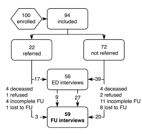 Between July 2015 and April 2016, 100 patients were enrolled, of whom 94 patients were eligible for inclusion. Of these, 22 patients (23%) were referred based on the zip code of their home address. As shown in the flowchart in Figure 2, for the initial ED interview 56 patients were interviewed, after which thematic saturation was reached. These qualitative results assessing the attitude of patients towards their own fall risk in the ED are described in detail by Shankar et al. [10]. At the 6 month follow-up, 59 (63%) patients were interviewed and 8 (8.5%) patients were deceased. The remaining 27 patients either refused (n=3) or could not be contacted, of which 15 patients had notes in their EMR about subsequent hospital visits resulting in incomplete follow up and 9 patients who were completely lost to follow up.