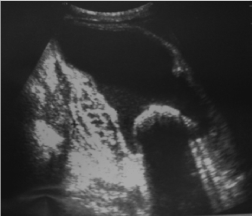Figure 1. Abdominal ultrasound: heterogeneous mass, with a liquid-liquid level and a hyperechoic, laminated arciform image, followed by a posterior shadow cone