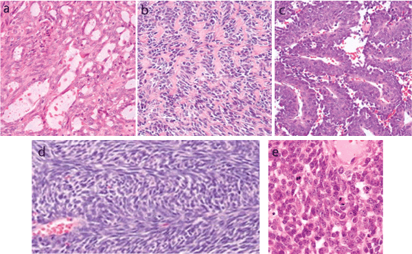 Figure 2. Typical histologic features of pulmonary synovial sarcoma characteristically composed of densely cellular interlacing fascicles (a). Unusual features that may lead to misdiagnosis include papillary formations (b), Verocay body-like areas (c), adenomatoid appearance (d), and rhabdoid morphology (e) or vague rosette formation.